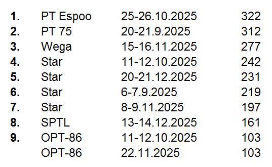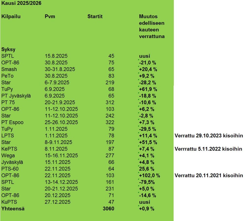 Tiukalle se meni, ja tarvittiin KuPTS:n Joulukisat. Syksy 2025 onnistui viime syksyn tapaan tekemään uuden syyskauden kilpailuaktiivisuusennätyksen (kaudesta 2008/2009 alkaen). Edellinen ennätys 3032 oli siis syksyltä 2024. Nyt ennätys kirjataan lukemin 3060. Uuteen ennätykseen tarvittiin 20 starttia Kuopiosta mutta saatiin 47! Parannusta edelliseen kauteen eli syksyyn 2024 verrattuna oli vain 0,9 %, mutta on aina hienoa, että mennään eteenpäin! Ennen koronavuosia eli syksyllä 2019 lukema oli vain 2424. Siitä on parannettu jo 26 %.