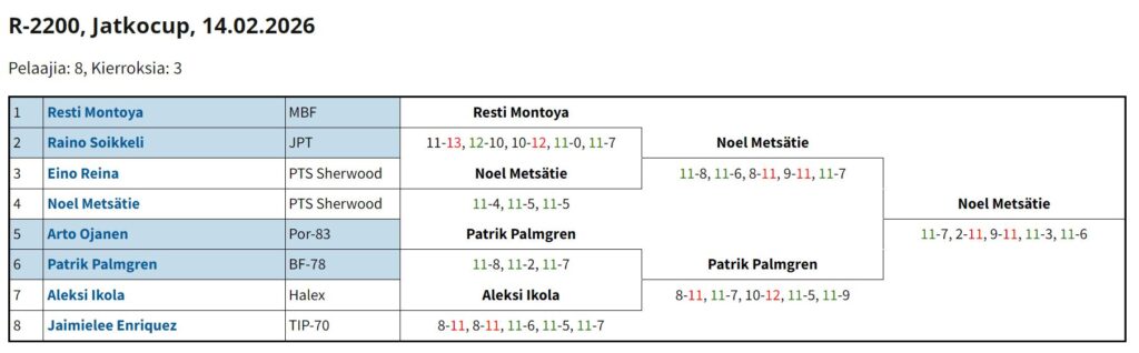 Otto Tennilän ja Mika Rauvolan välinen semifinaali oli jo tiukempi vääntö, mutta Tennilä voitti 3-1. Kahlos selvitti Pitkäsen 3-0.
