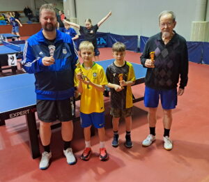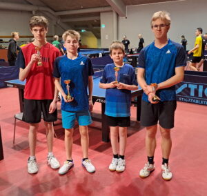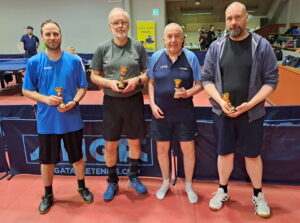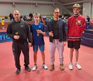 Kuvassa vasemmalta toiseksi sijoittunut pari Ville Lappi/Hannu Sihvo (Wega), luokkavoittajapari Junjie Wu/Vladyslav Matyko (MBF), kolmanneksi sijoittuneet parit Eino Reina/Noel Metsätie (PTS Sherwood) ja Sami Pyykkö/Vesa Lappi (Wega).