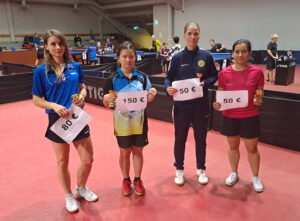 Naisten kaksinpelissä jäi valitettavasti yksi pelaaja pois jo valmiiksi aivan liian pienestä pelaajajoukosta. Siten pelaajia oli vain neljä, mutta naispingiksen tukemisen nimissä luokka vedettiin läpi täysin rahapalkinnoin.