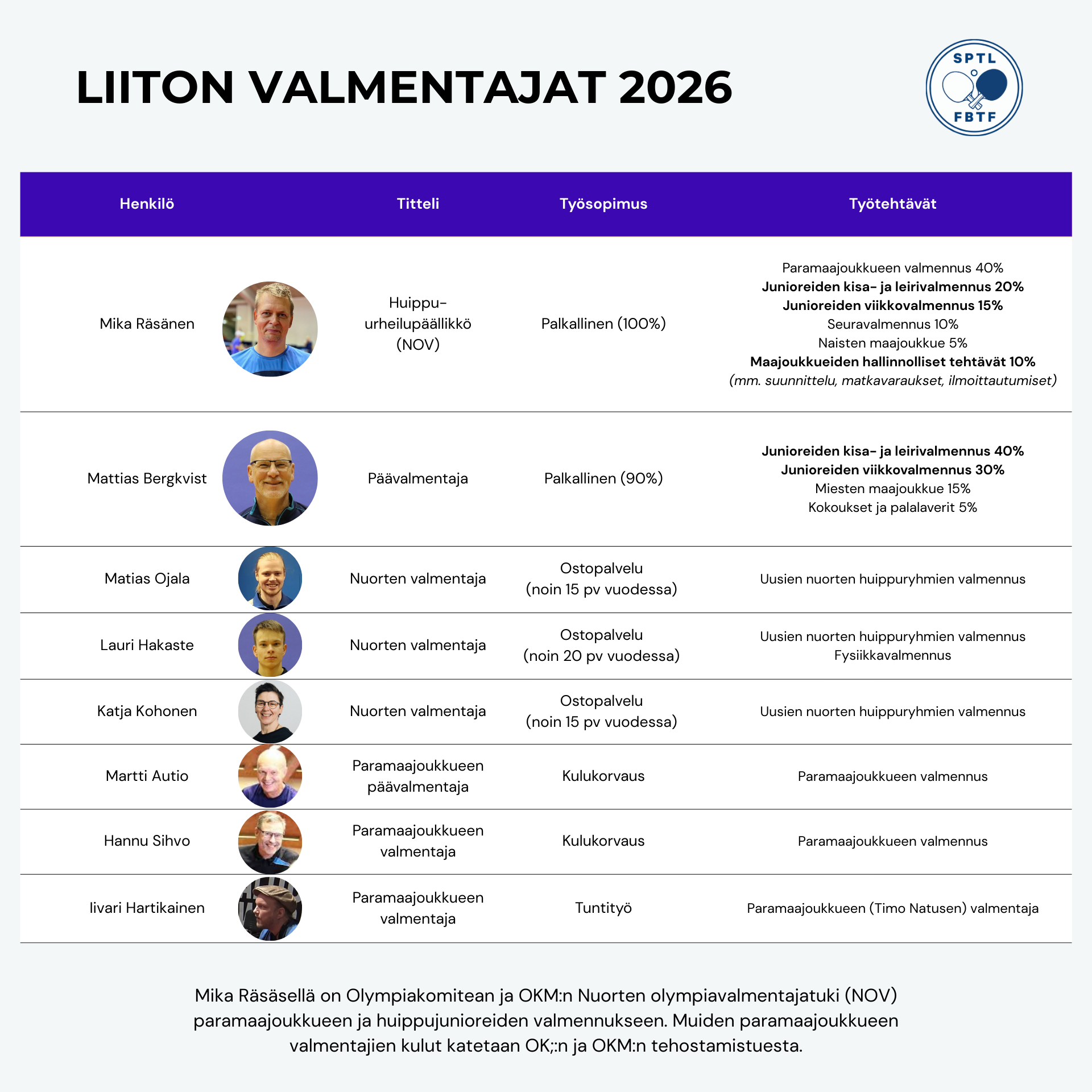 Liiton valmennustoiminta keskittyy vuonna 2026 edelleen Ruskeasuolle. Siellä panostusryhmän pelaajille tarjotaan ilmainen harjoittelumahdollisuus maanantaista torstaihin klo 17-20. Päävalmentajana toimii Mattias Bergkvist. Mika Räsänen valmentaa ryhmässä toisena valmentajana 1-2 kertaa viikossa. Ryhmäharjoittelun päälle panostuspelaajille tarjotaan yksityisvalmennusta.