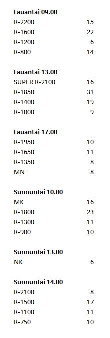 Ohjelma, tulokset ja sarjataulukko (aikaero 1 h)