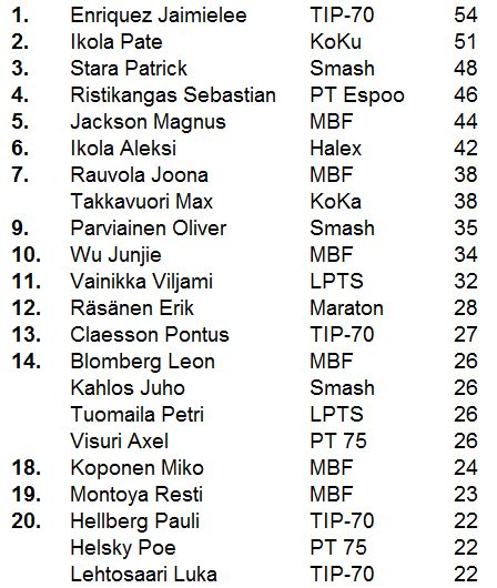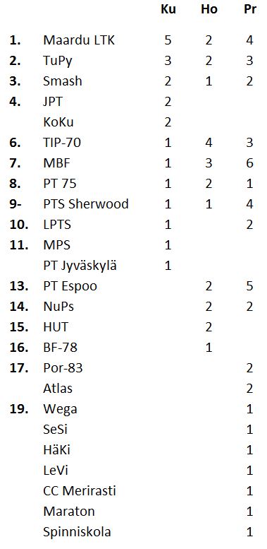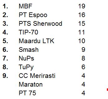 TuPy otti hienosti kakkospaikan (3-2-3) ja kolmospaikka meni Smashille (2-1-2). Kestomenestyjät TIP-70, MBF ja PT Espoo putosivat nyt sijoille 6,7,13.