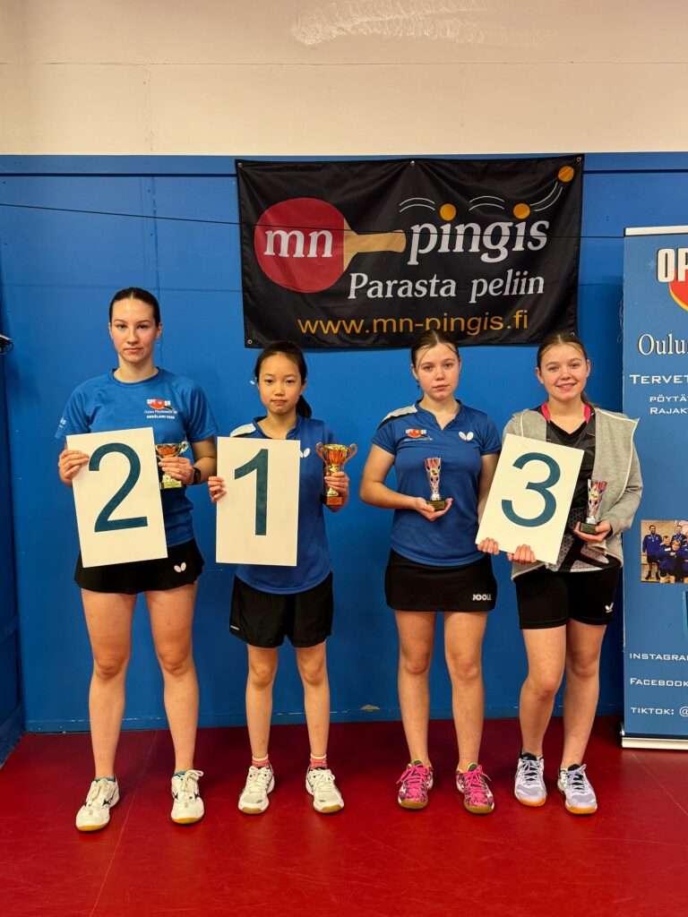 Kuva: Naisten kaksinpelin palkitut, 1. Jiali Lu (OPT-86), 2. Tamila Vlasova (PT Espoo), 3. Arina Bril (OPT-86) ja Taisiia Bril (OPT-86)