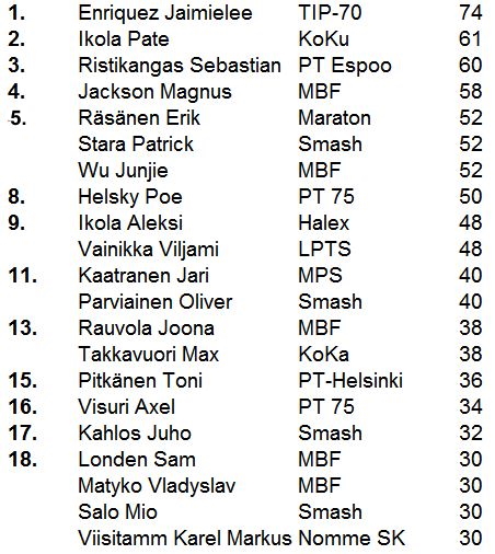MBF oli jälleen ykkönen pelaajamäärissä. Toiseksi nousi viime kerran kolmonen Smash ja myös PT Espoo ohitti TIP-70:n. Myös PTS Sherwoodilta hyvää suorittamista! TOP-2 tuli Helsingistä varmaan ensimmäisen kerran koskaan.