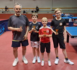 Kuvassa vasemmalta toiseksi sijoittunut Axel Visuri (PT 75), luokkavoittaja Yuri Afanassiev (PT Espoo), kolmanneksi sijoittuneet Aleksi Ikola (Halex) ja Noel Metsätie (PTS Sherwood).