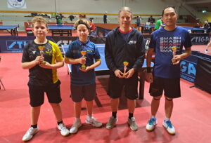 Kuvassa vasemmmalta toiseksi sijoittunut Aaro Mäkelä (PT Espoo), luokkavoittaja Junjie Wu (MBF), kolmanneksi sijoittuneet Jaimielee Enriquez (TIP-70) ja Resti Montoya (MBF).