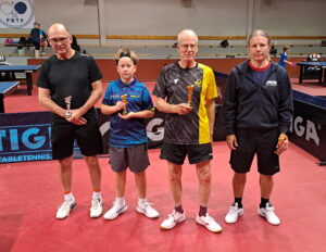 Kuvassa vasemmalta toiseksi sijoittunut Erik Räsänen (Maraton), luokkavoittaja Pate Ikola (KoKu) ja neljänneksi sijoittunut mutta myös kolmas palkinto Peter Eriksson (MBF). Toinen kolmanneksi sijoittunut Toivo Ridal (Atlas) oli lähtenyt ennen palkintojenjakoa. Vasemmalla pöydällä hänen pokaalinsa.