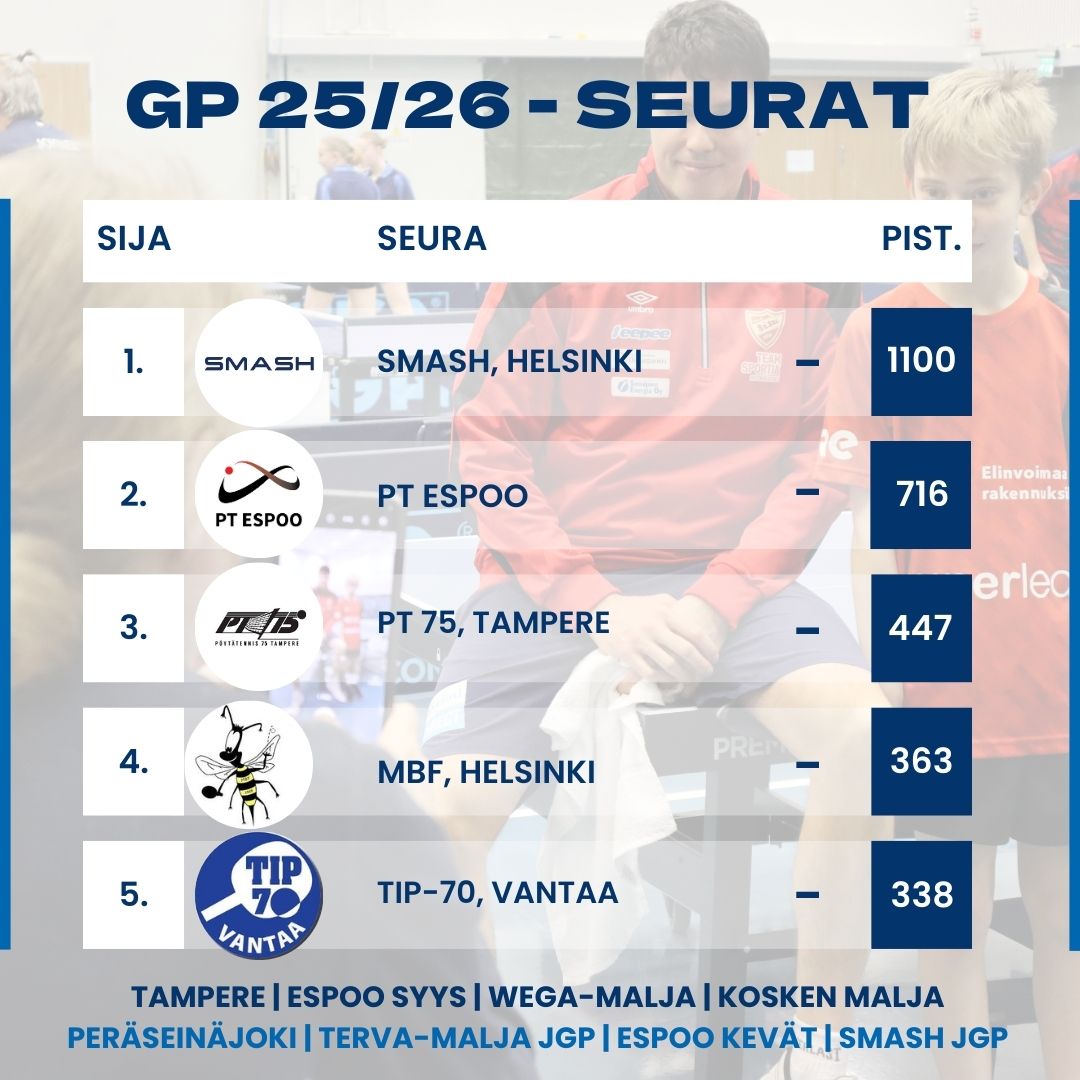 PT 75:n Riku Autio pelasi Kosken Maljan voittoon ja nousi samalla miesten GP-luokan ykköseksi ohi syyskauden kisaa hallinneen Smashin Juho Kahloksen. Naisissa kärkipaikalla jatkaa MBF:n Ildiko Kadar. Seurojen välisessä kilpailussa Smash repäisi mainion juniorimenestyksensä ansiosta lisää pesäeroa muihin. Seuraava GP-kisa pelataan 7.-8. helmikuuta Peräseinäjoella.