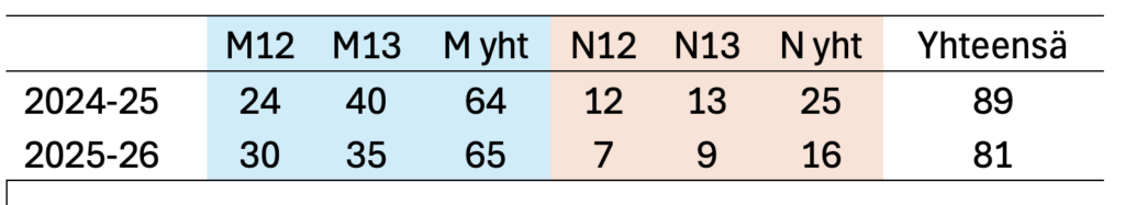 12- ja 13-vuotiaat pelaajat SM-kisoissa kausilla 2024-25 ja 2025-26