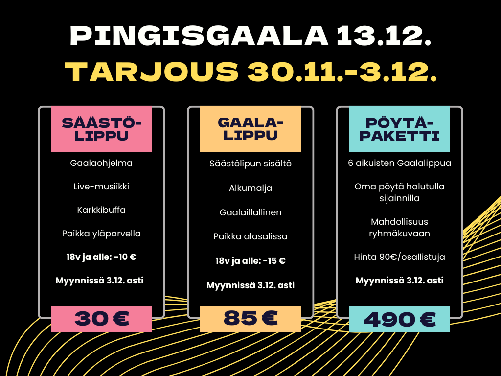 (30.11.2025, Henri Pelkonen)Pingisgaala la 13.12. klo 19 Hotel Arthurissa – Tarjoushinnat 3.12. saakka!