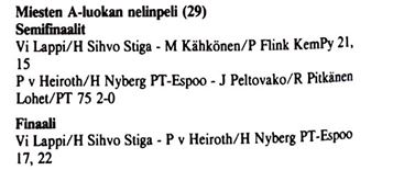 A-poolissa PT Jyväskylä yllätti MBF:n taistossa lohkon kakkospaikasta. Olavi Moilaselle voitot Linus Lundströmistä 3-2 ja Magnus Jacksonista 3-0. Kolmas voitto merkittiin Lauri Nirkkoselle 3-1 Linus Lundströmistä. KuPTS rallatteli puhtaisiin 3-0 voittoihin ilman erätappioita kaikissa peleissään. OPT-86 3 oli hakemassa oppia näin kovista peleistä ja joutui viime hetken sairastumisen vuoksi pelaamaan vieläpä kahdella pelaajalla.