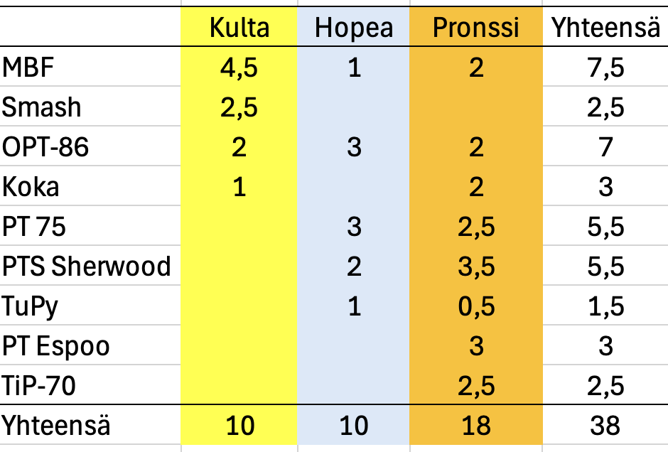Mitaleissa laskettuna järjestävä seura MBF oli tällä kertaa menestyksekkäin OPT-86:n ollessa kalkkiviivoilla.